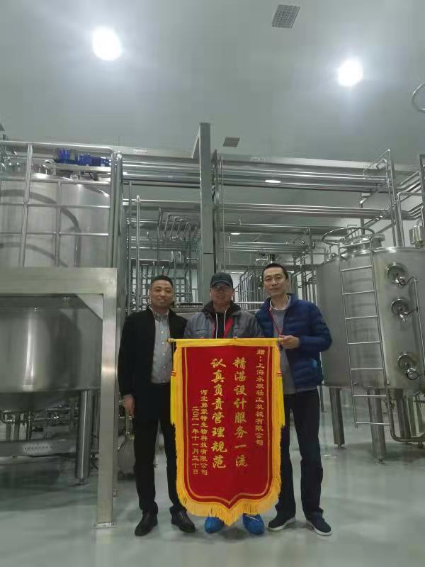2021年11月30日,在該項目的安裝調試現場,上海東富龍承歡收到了河北弗蒙特生物科技有限公司贈送的錦旗,精湛的設計工藝和高效的管理規范受到河北弗蒙特的高度贊揚。錦旗上熠熠生輝的字跡,既是鼓勵,又是鞭策。目前該項目已安裝調試完畢,進入投料生產階段。